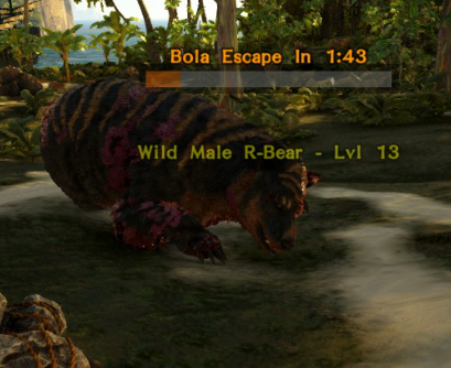 - wirfst du die Bola auf das Tier und bringst es zu Boden. Achte dabei auf den Timer, welcher anzeigt wie lange das Tier noch gefesselt bleibt.