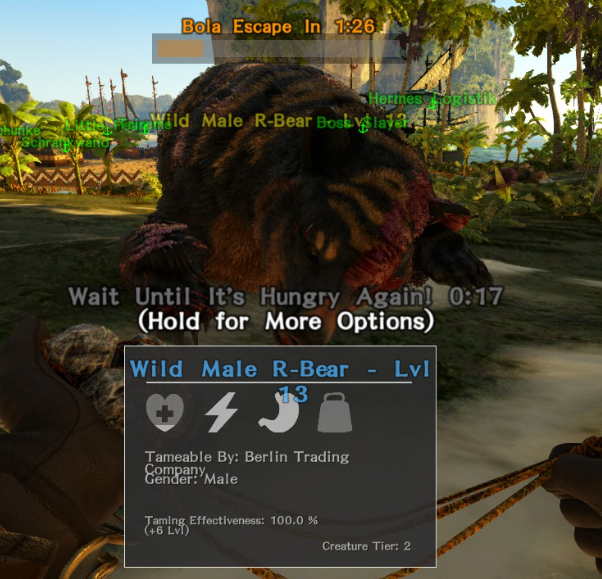 Das wichtigste beim zähmen per Bola ist Timing. Damit du keine Effizienz beim Zähmvorgang einbüßt darfst du dir zwischen dem Füttern nicht zu viel Zeit lassen. Insbesondere beim Zähmen von aggressiven Tieren solltest du also auf deine Gesundheit achten und zur Not auch einen Schlafsack oder ein Bett in der Nähe platzieren. Denn wenn du erst vom Schiff zu deiner Leiche laufen musst um weiter zu zähmen, dann dauert das einfach zu lange. Sollte dir das doch passieren, empfehle ich den Zähmvorgang abzubrechen und zu warten bis das Tier seine Gesundheit vollständig wiederhergestellt hat. Dadurch wird auch der Zähmfortschritt und die Effizienz zurückgesetzt.