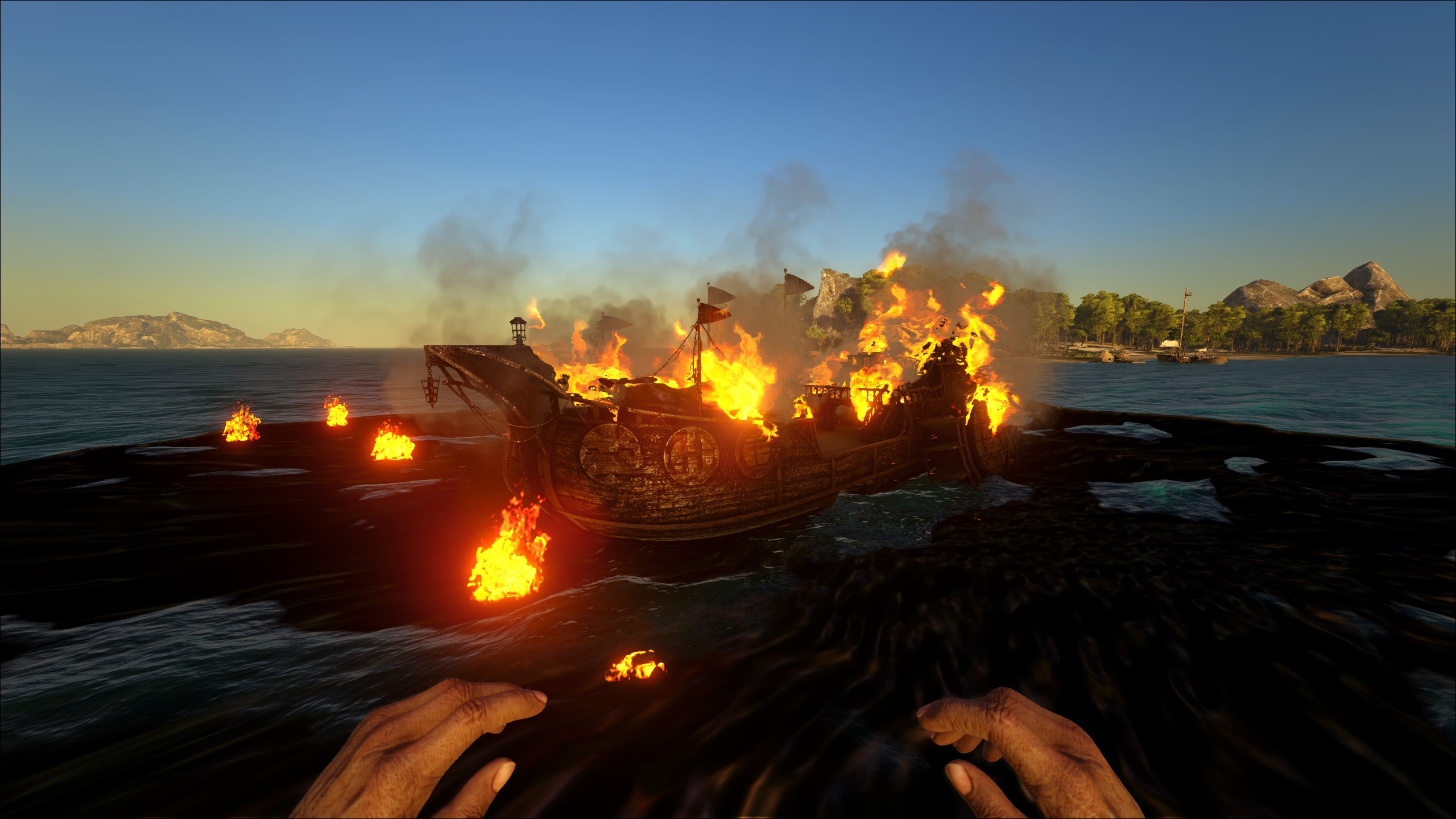 Von einem Ölteppich umgeben verspricht dieses Wrack euch interessante Beute, jedoch solltet ihr davon absehen mit Schiff im Feuer zu parken, eigentlich auch Logisch!
